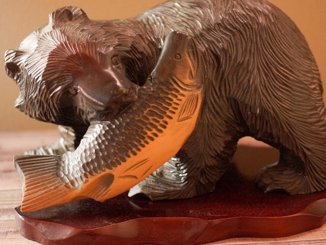 鮭を咥え始めたのは、第二次世界大戦後になってから。戦後になって工芸品としての木彫り熊がよく売れるようになり、現在の鮭を咥えた姿が定番になったようです。