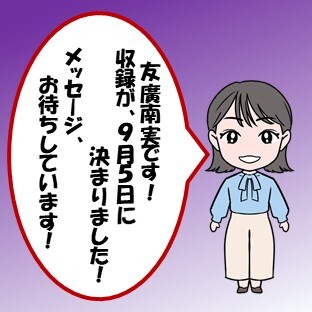アナののびしろ 9/6、13の担当は・・・ 2025.08.31(日) トーク アナ出演 次世代人気アナを目指す若手アナウンサーたちがしのぎを削る、のびのびトーク番組。 毎週、様々なのびしろを求め、清く正しく美しくレポートします。 [この番組の画像一覧を見る] 友廣アナへのメッセージ募集中! 9月6日、13日の担当は 友廣アナウンサーです! メッセージは、 9月5日までに送ってください! 瀧川アナが、 8月30日の放送で 「この収録風景を絵に描きます!」 の絵がこちらです! 関連記事 11/28 小川アナ&Christopher 11/21 小川アナ&佐藤アナ 11/14 小川アナ&斉藤アナ 11/7 小川アナ&中村アナ 10/31 小川アナ&斉藤アナ