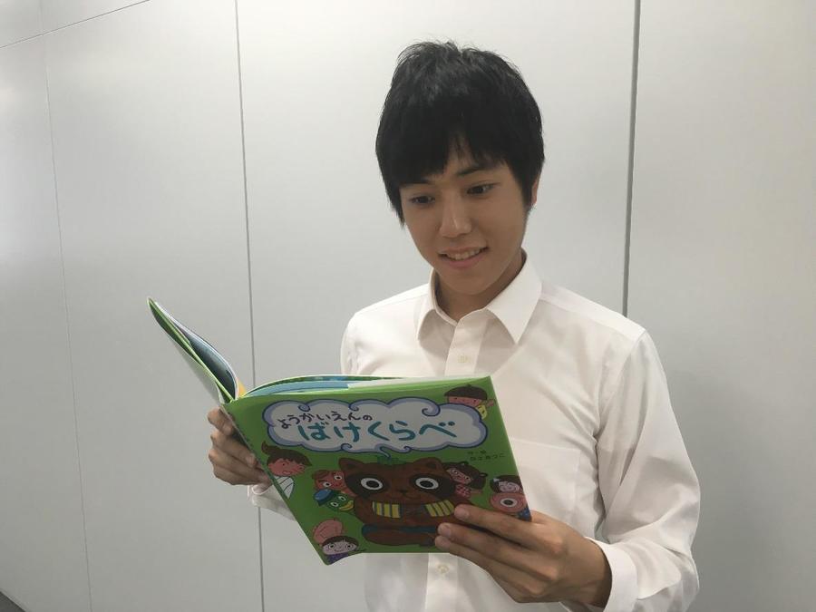 ようかいえんのえんそくで、ばけだぬきの「ばけた」とたぬきの「ぽんきち」がばけくらべをしています。