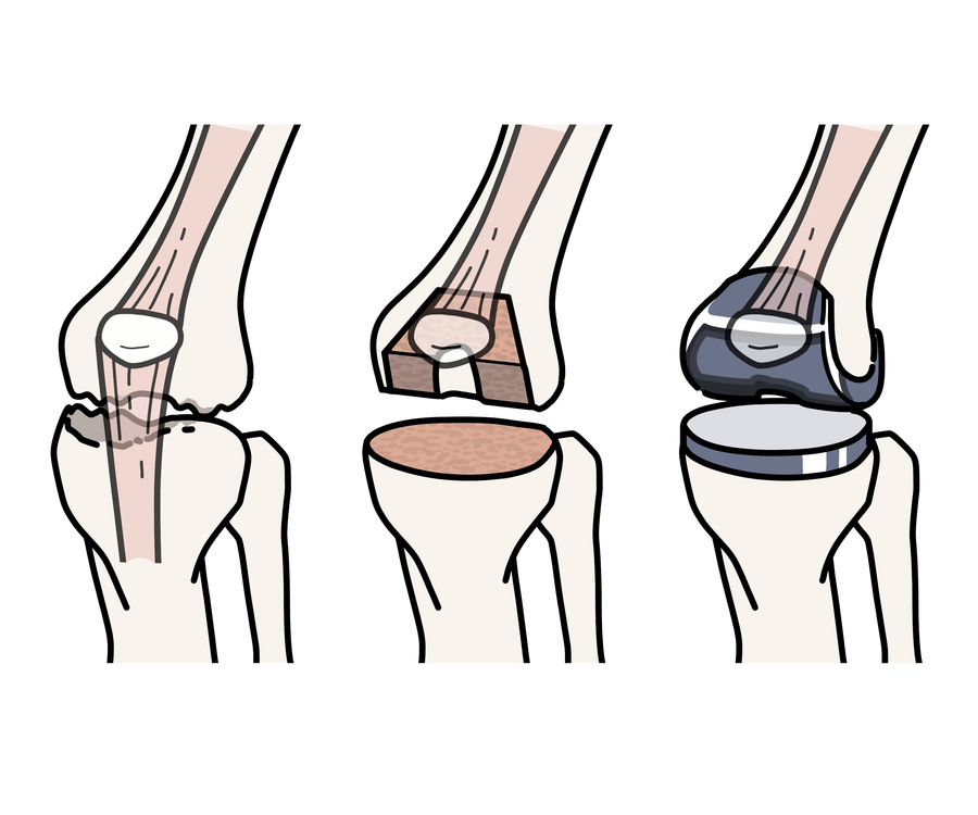 膝の軟骨を全部交換してしまう全人工関節置換術と、内側の痛んでしまった部分だけの軟骨を交換する部分人工関節置換術です。