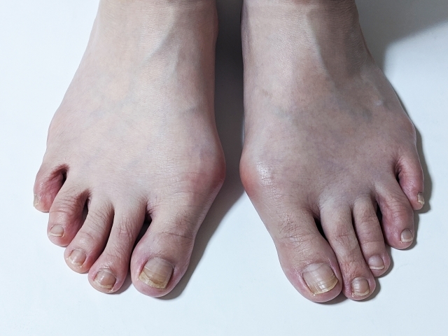 親指の付け根の部分が飛び出して見えていく特徴があり、親指が曲がるだけではなく、靴に当たって痛みを伴うことが多いです。