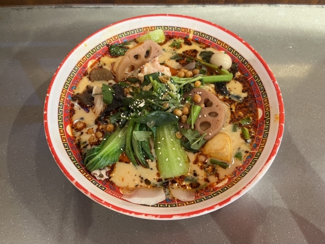 栄4丁目・池田公園近くにある「食尚大碗麻辣湯」はスープが濃厚で、肉はハムや練り物。サービスとしてペットボトルのジュースやお茶がもらえるそうです。