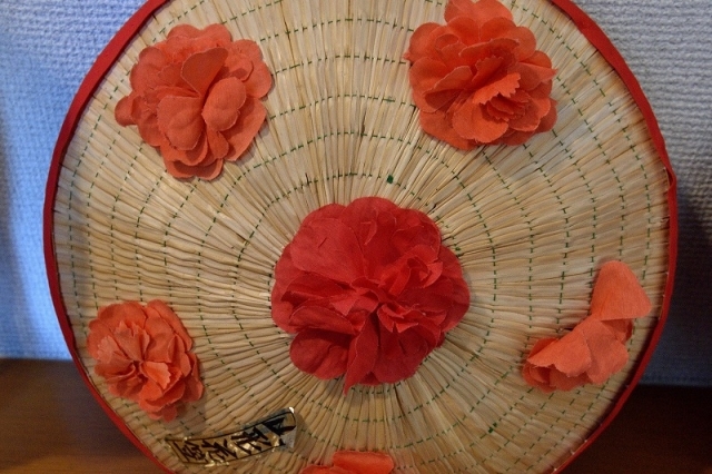 笠についている花は現在、化学繊維の布を加工して作られていますが、これは山形県の県花である紅花がモチーフとなっているとのこと。