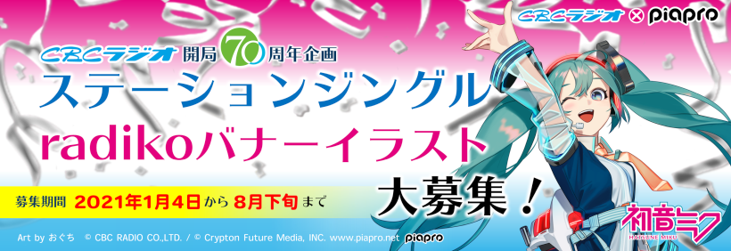 「初⾳ミク」を開発したクリプトン・フューチャー・メディア株式会社が運営するコンテンツ投稿サイト"piapro(ピアプロ)"では、CBCラジオと初⾳ミクの公式コラボレーション企画を8月下旬まで展開中です。