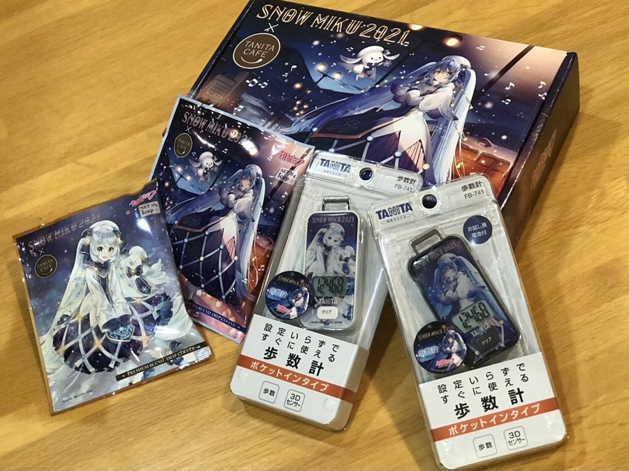 現在タニタさんのオンラインショップでは、SNOWMIKU2021とコラボした「歩数計」と「コーヒー」も販売されていますよ。