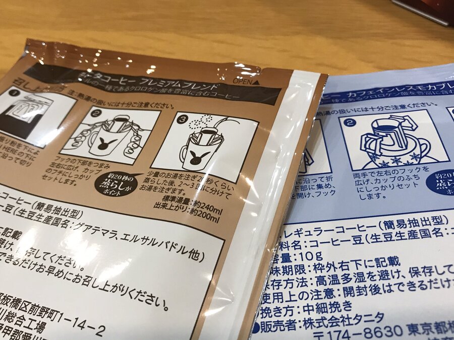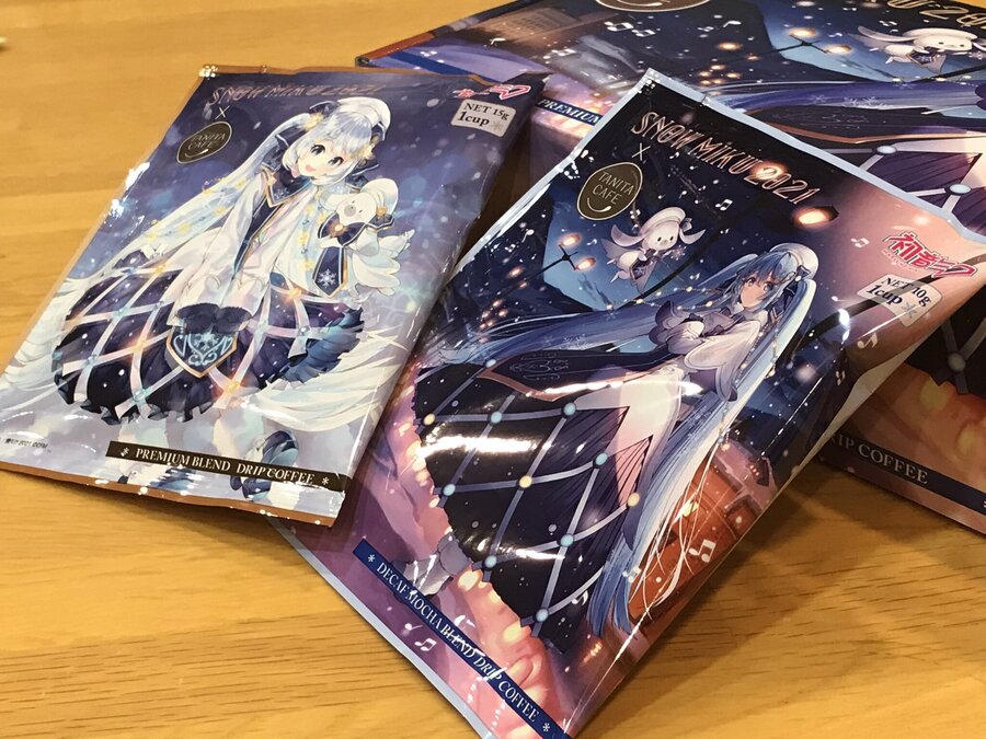そしてクロロゲン酸がたっぷり入った「タニタコーヒー」は、「プレミアムブレンド」と「カフェインレスモカブレンド」の2種類が、雪ミク特別パッケージに5個ずつ入ってます。