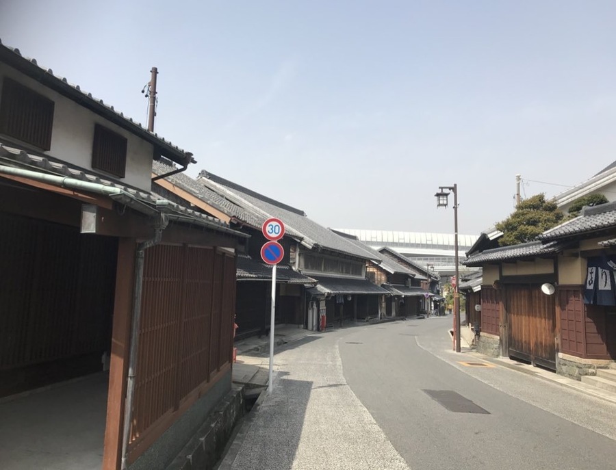 東海道沿いにあり、国から「重要伝統的建造物群保存地区」に選定された名古屋市緑区有松の街並み。奥に見える名古屋第二環状自動車道(名二環)との対比が印象的。