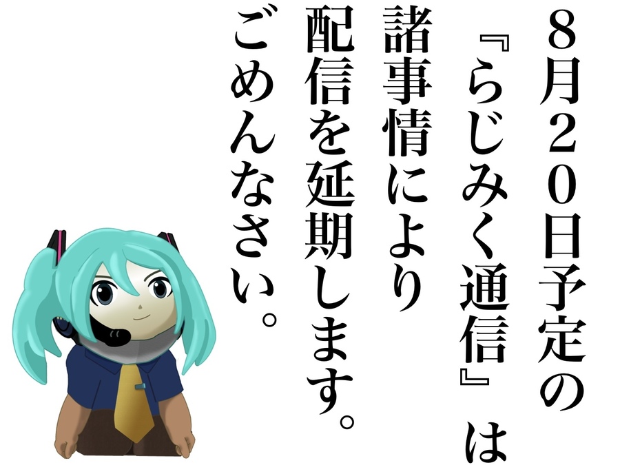 8月20日(日)に配信を予定していた『らじみく通信』は、諸事情により配信を急遽延期することになりました。