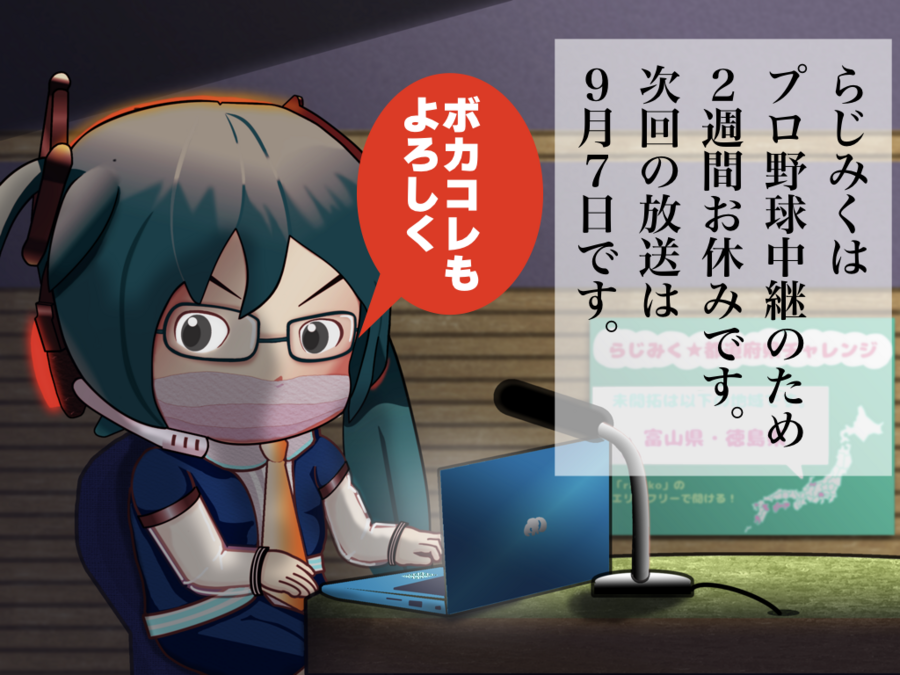 | お知らせ 8/24、8/31の『RADIO MIKU』は、プロ野球中継のためお休みします。 次回オンエアは9月7日です。ご了承ください。 またチームらじみくは、8/21(木)~25(月)開催の『ボカコレ2025夏』のエキシビションに参加します。 投稿は番組公式Xのポストでお知らせします。お楽しみに! |