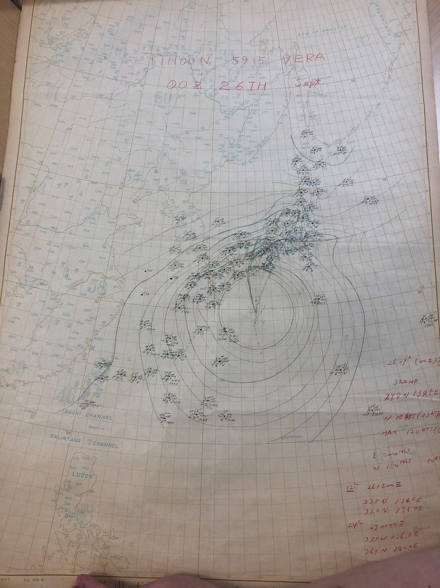 (饒村さん所蔵:伊勢湾台風襲来時の天気図)