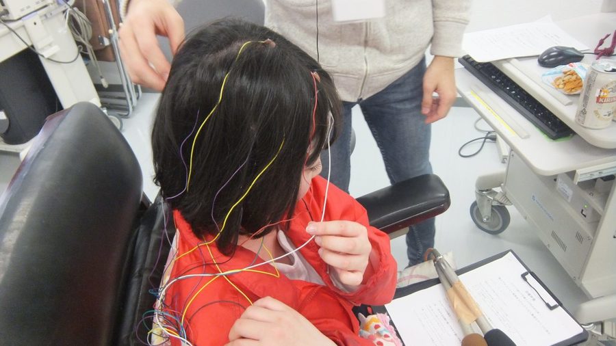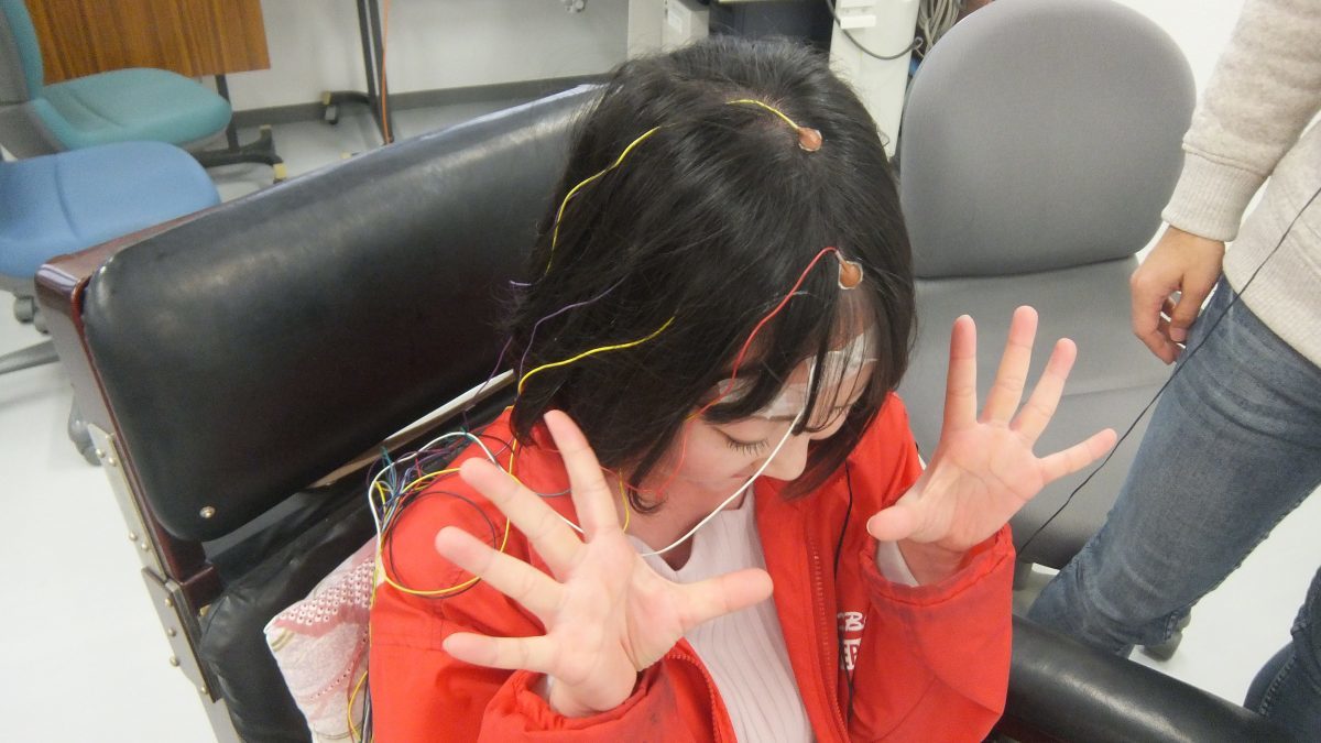 その端子からはカラフルな細いコードが伸び、脳波を測定する機械に繋がっています。