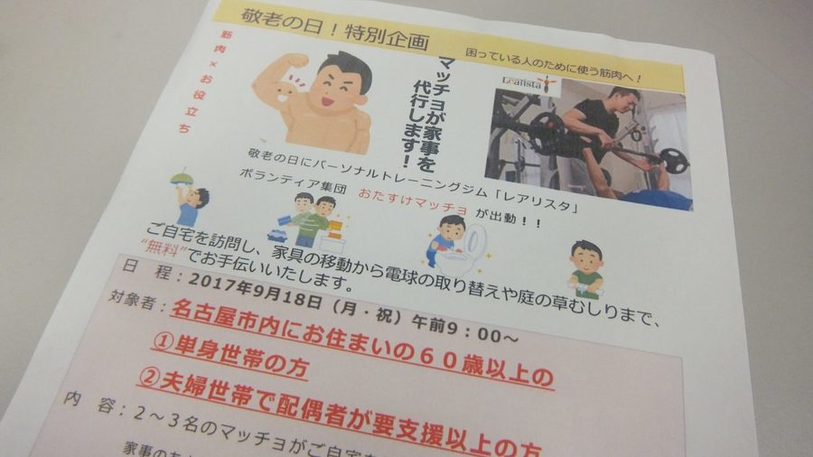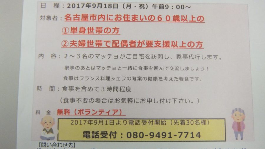 今回の"お助けマッチョ"は、名古屋市内在住の60歳以上で独り暮らしの方、または要介護認定で「要支援」の配偶者がいる夫婦世帯が対象となります。