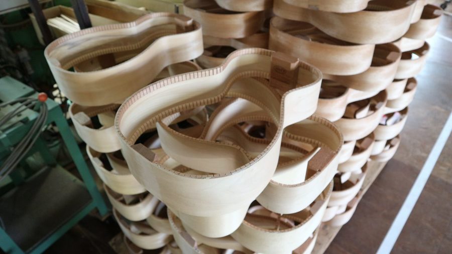 ギターは、ボディとなる木材をじっくりと乾燥させ、それから部品に切り分けたり、板を曲げたりしてギターの形に作っていくんです。