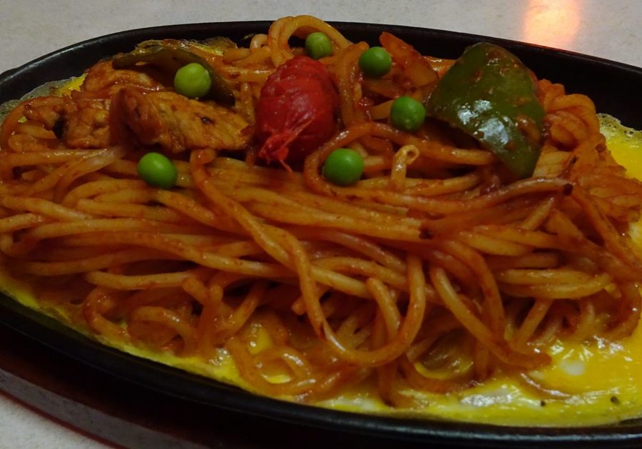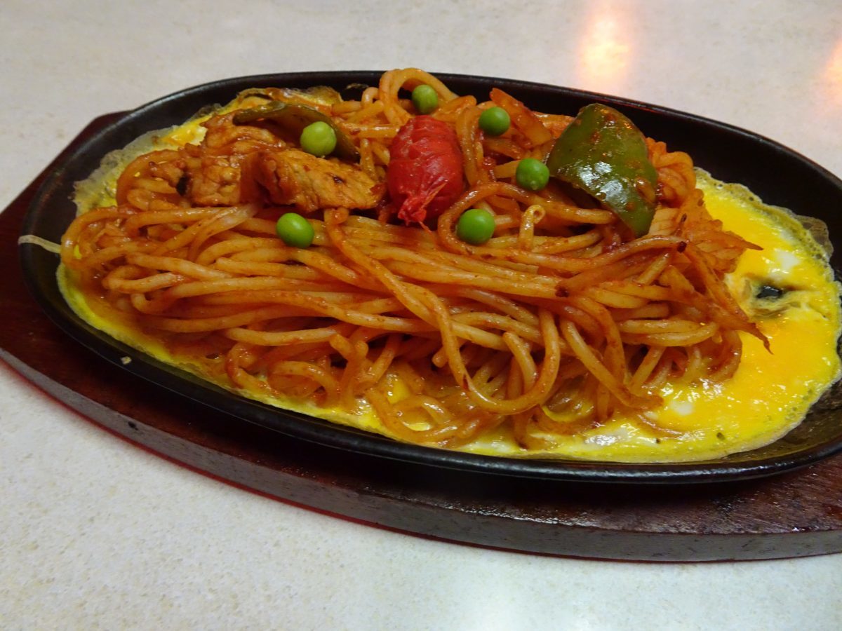 熱々の鉄板の上に、溶き卵が敷かれ、その上にトマトケチャップ味のスパゲティ(東日本ではナポリタン、西日本ではイタリアンと呼ばれるもの)。