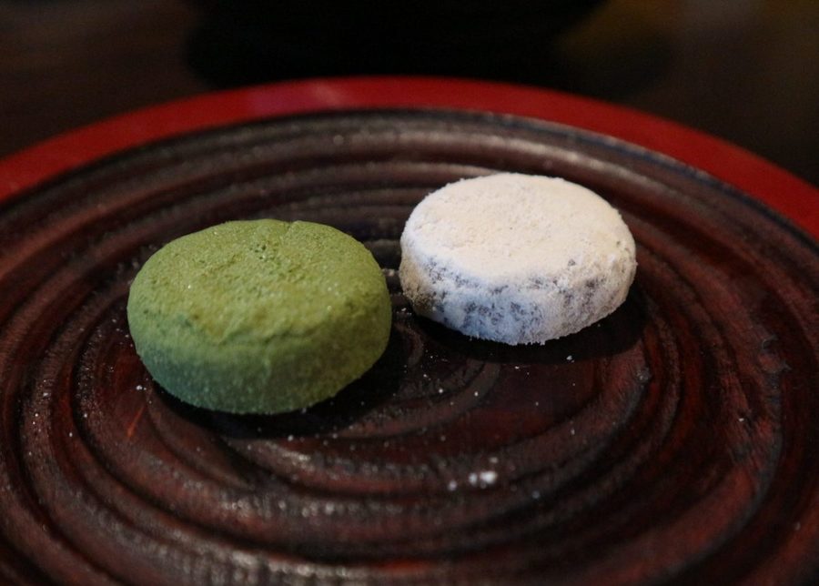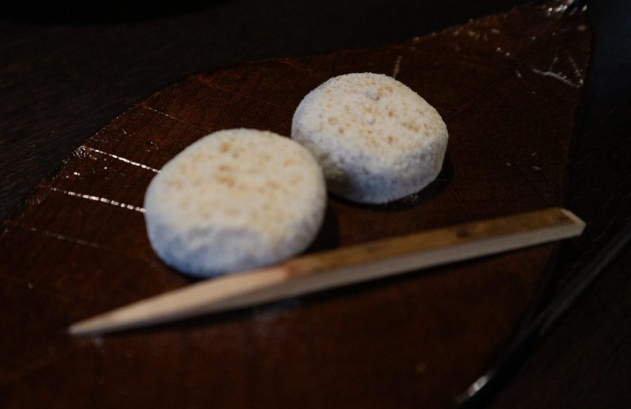 こしあんをお餅菓子で包んであり、その上から粉雪のような和三盆糖をまぶしたひと口大のお菓子。