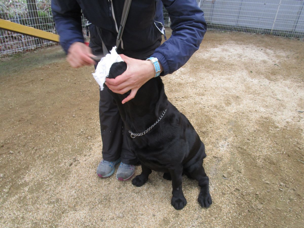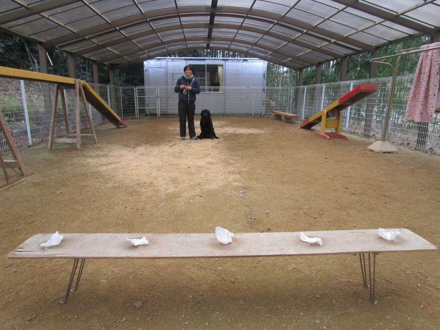 私の臭いがついた布きれをガウディ君に嗅がせた後、5つの布切れの中から、最初に嗅いだ布切れを当てるというものです。