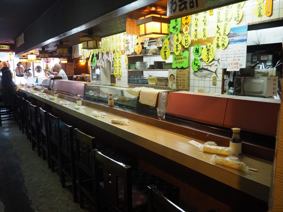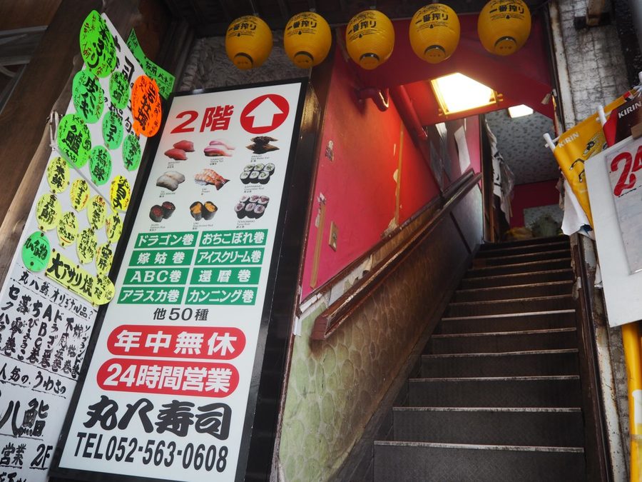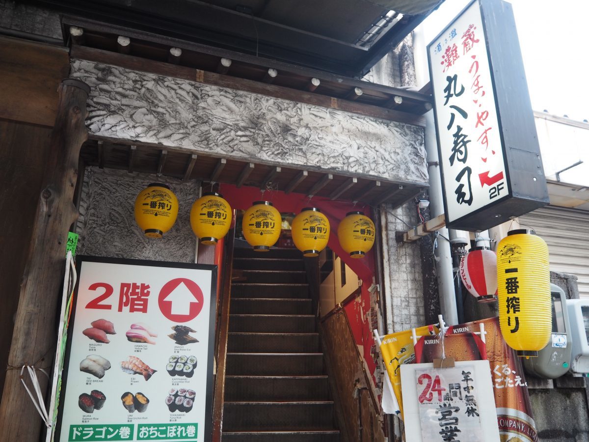 市場利用者のための飲食店がひきめき合う周辺で、名物店と呼ばれているのが「丸八寿司」駅前店。