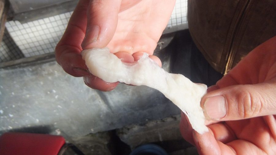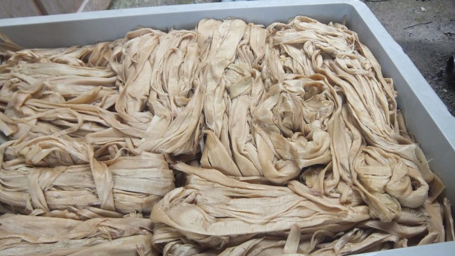 皮の表面を削り、肌色の部分を煮て柔らかくし、叩くなどして繊維状にし紙を漉きます。