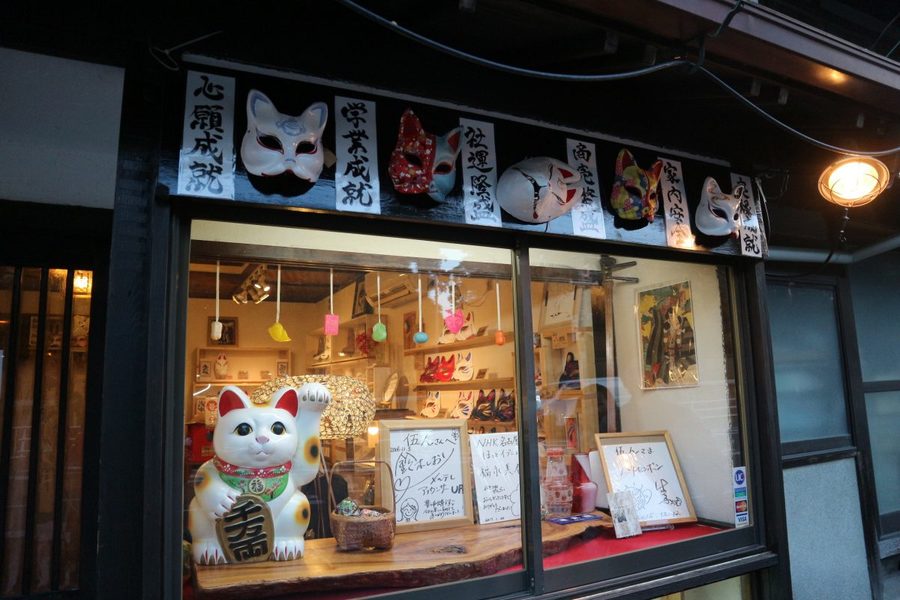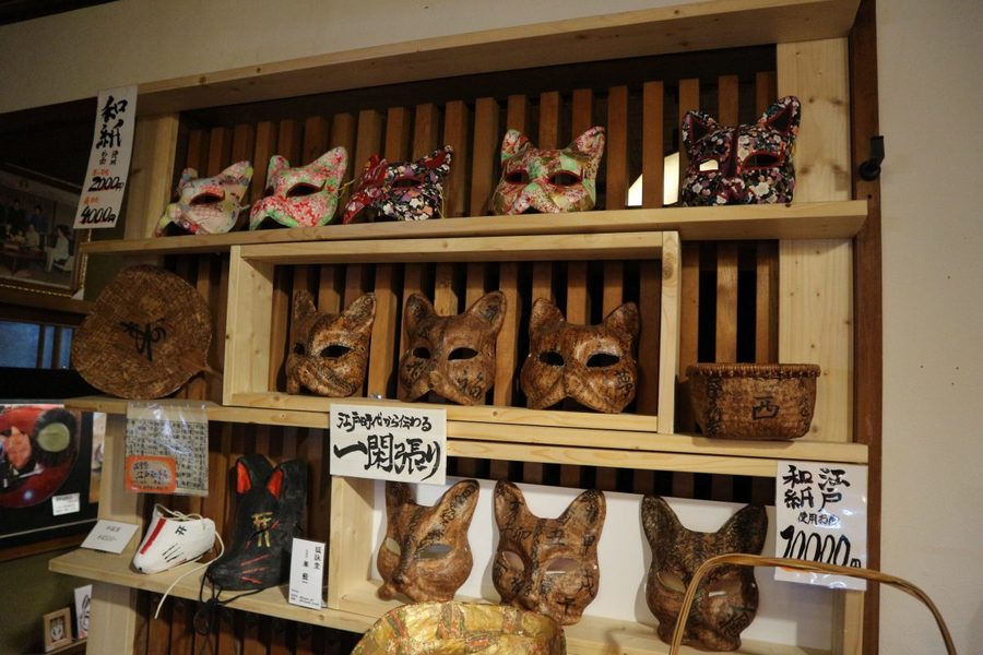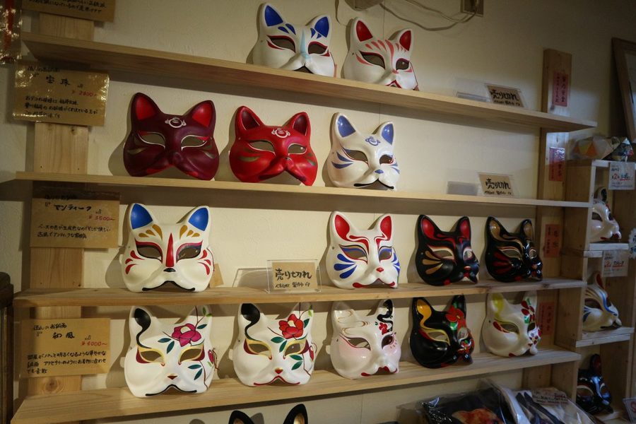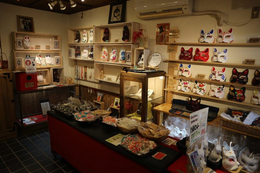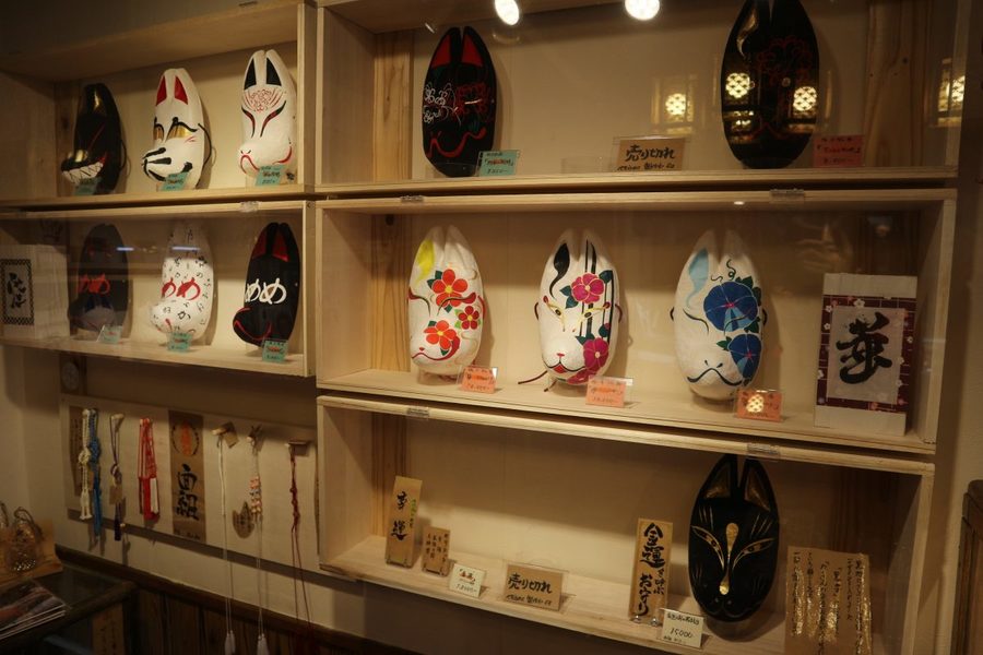 さらにお店の中に入っても壁の棚やショーケース、お店の至るところに狐のお面が飾られています。