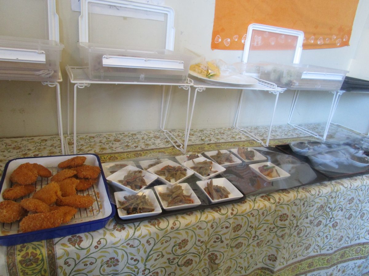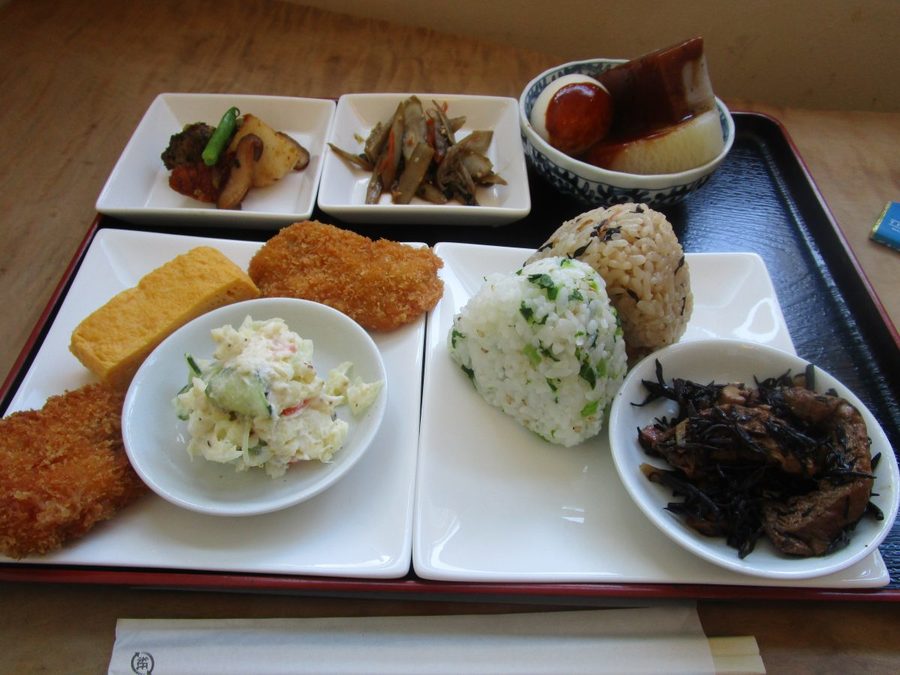 おにぎりや惣菜およそ10品目が並んでいて、自分で好きなだけ取ってお会計をするカフェテリアです。