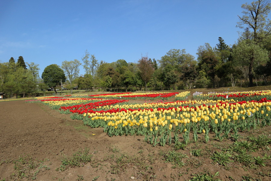 丘の上から下を見下ろすと緑いっぱいで、チューリップ畑や