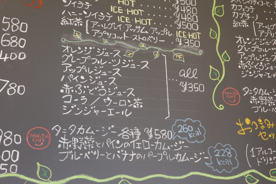 かわいいメニュー板ですが、タニタカフェならではと感じたのが、カロリーが書かれたメニュー表。