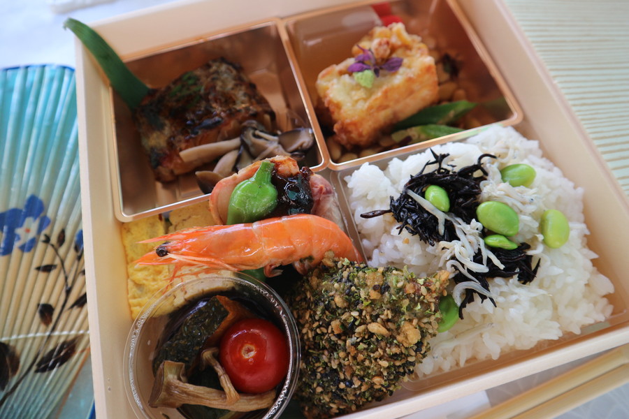 季節の食材をふんだんに使ったお弁当。木目調の入れ物がオシャレ!