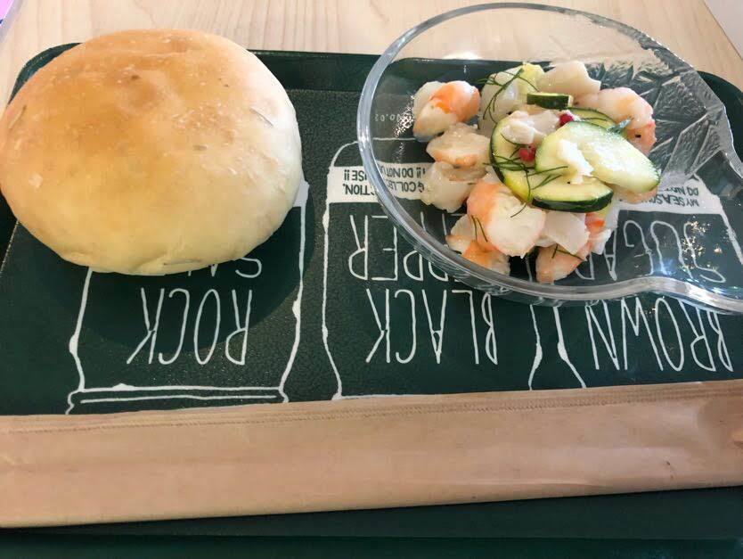 私も「ローズマリーパン」と「ピンクペッパーが彩る♪ グレープフルーツとシーフードのマリネ」を頂きました。