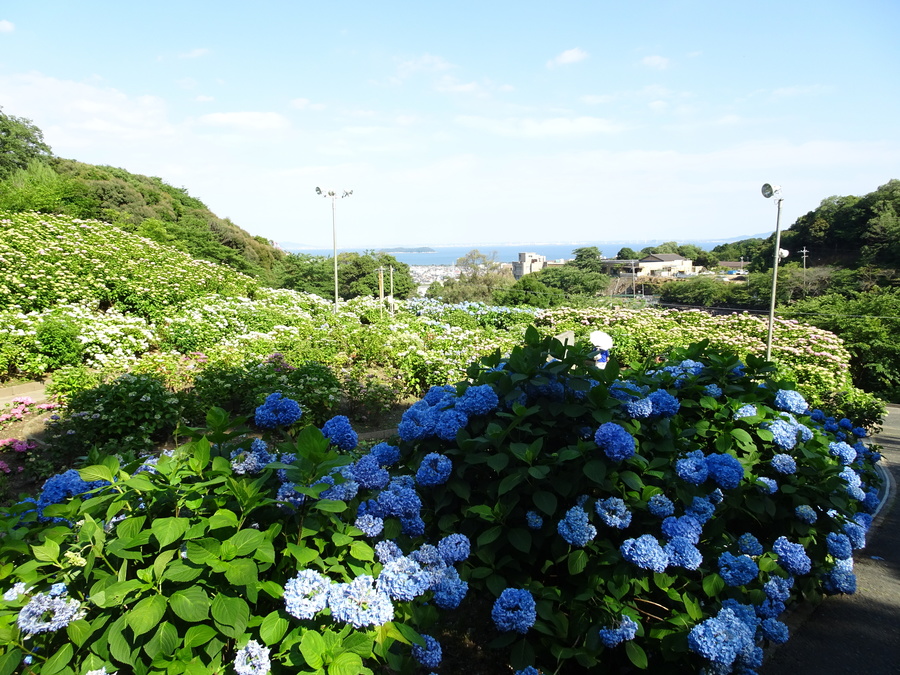 また、あじさいが咲き誇る小高い丘を登り、頂上まで行くとあじさいの絨毯の向こうに、三河湾を一望できる絶景となっています。