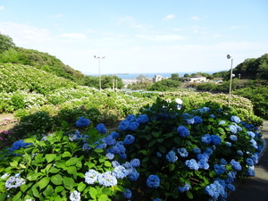 あじさいの絨毯の向こうに三河湾を一望できる絶景となっています