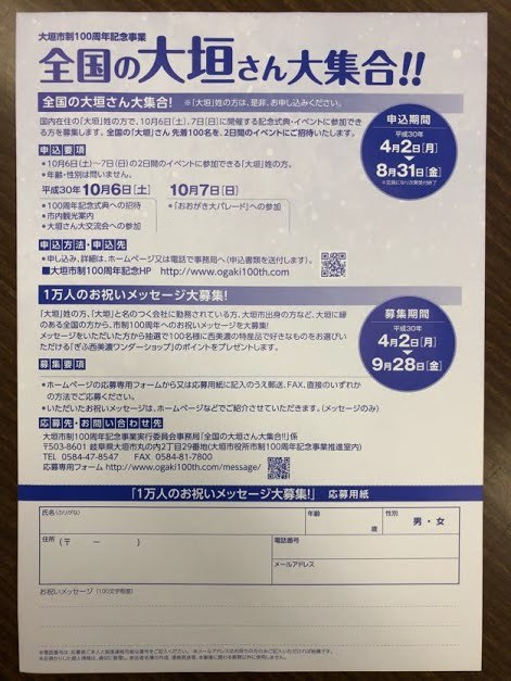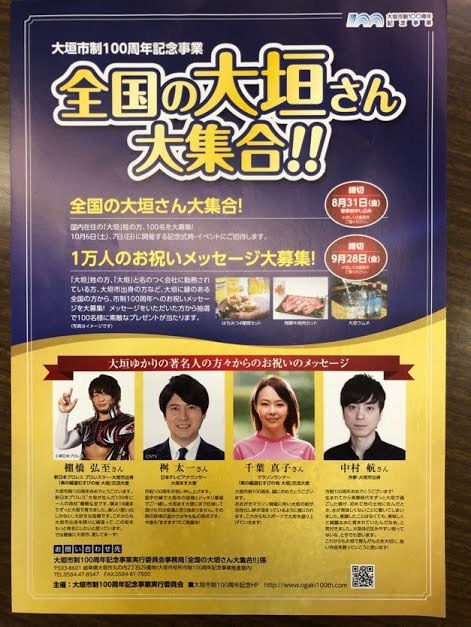全国にいる、名字が「大垣」の人に大垣市で集まってもらい、大垣市の市制100周年をお祝いしてもらうというイベントです。