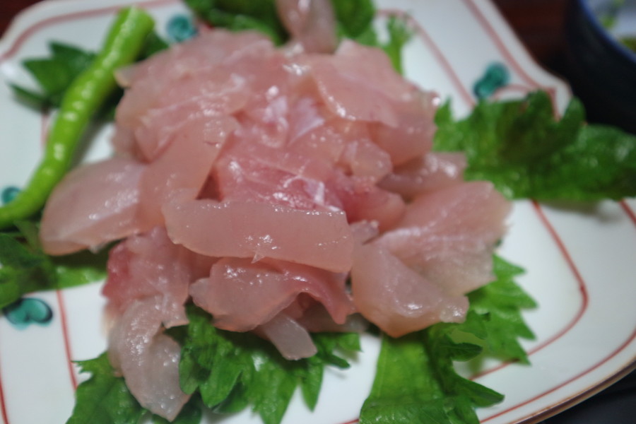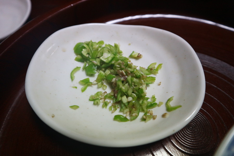 お刺身と言えばワサビ、と私たちは考えますが、尾鷲は山と海に囲まれており、昔は流通事情が悪かったため、ワサビを手に入れるのが難しく、その代用としてこの青唐辛子を刻んだものを使っていたんだとか。