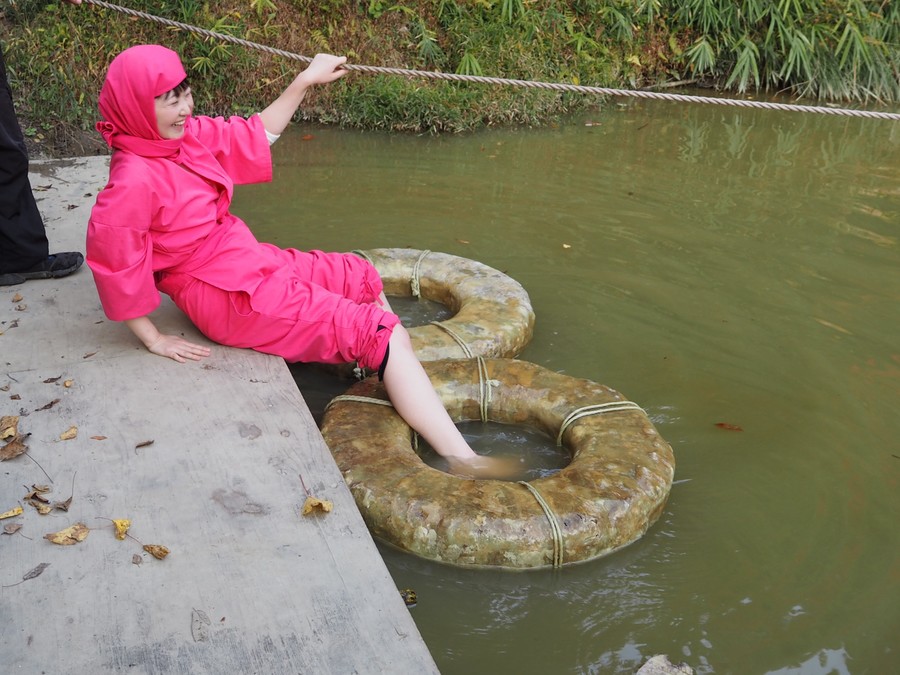 水面歩行器を使って水の上を渡る水蜘蛛の術など