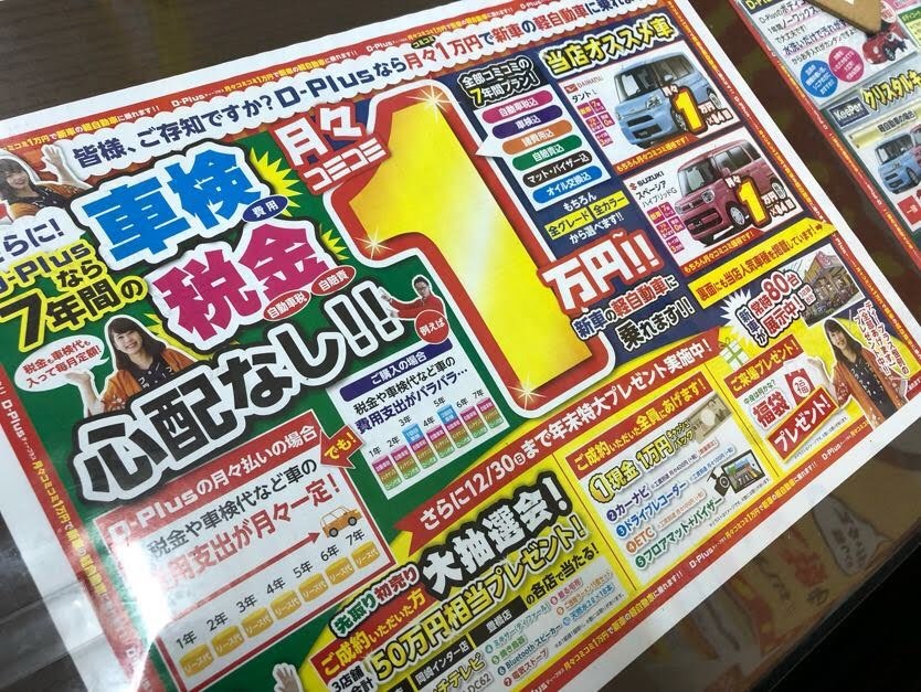 全国で展開されているフラット7というクルマ販売モデルで、月々1万円お支払いいただければ新車の軽が乗れてしまうんです!