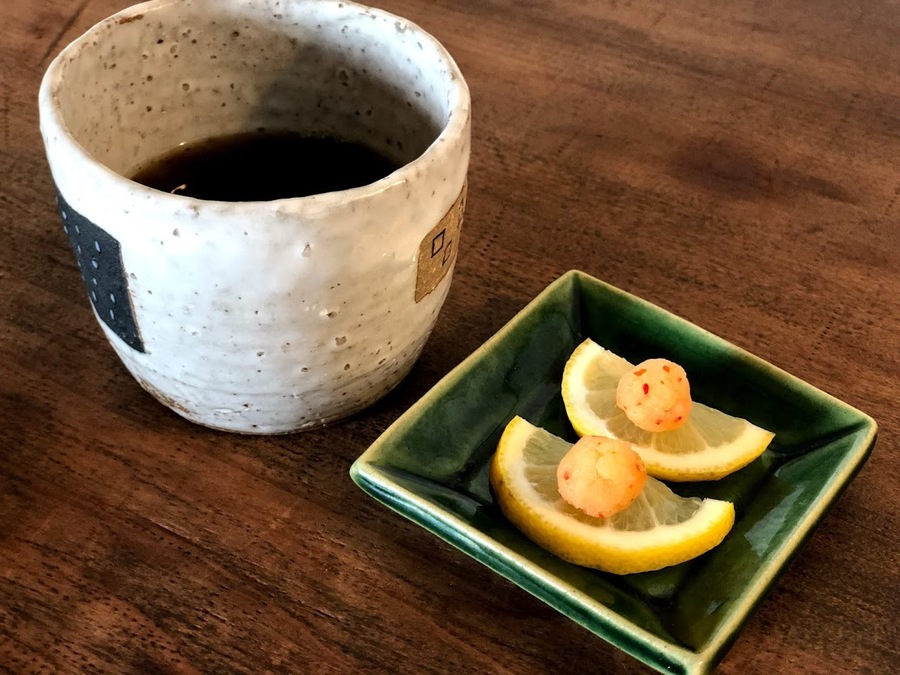 つゆには薬味として薄切りにしたレモンともみじおろしも加えるんです。