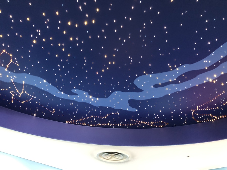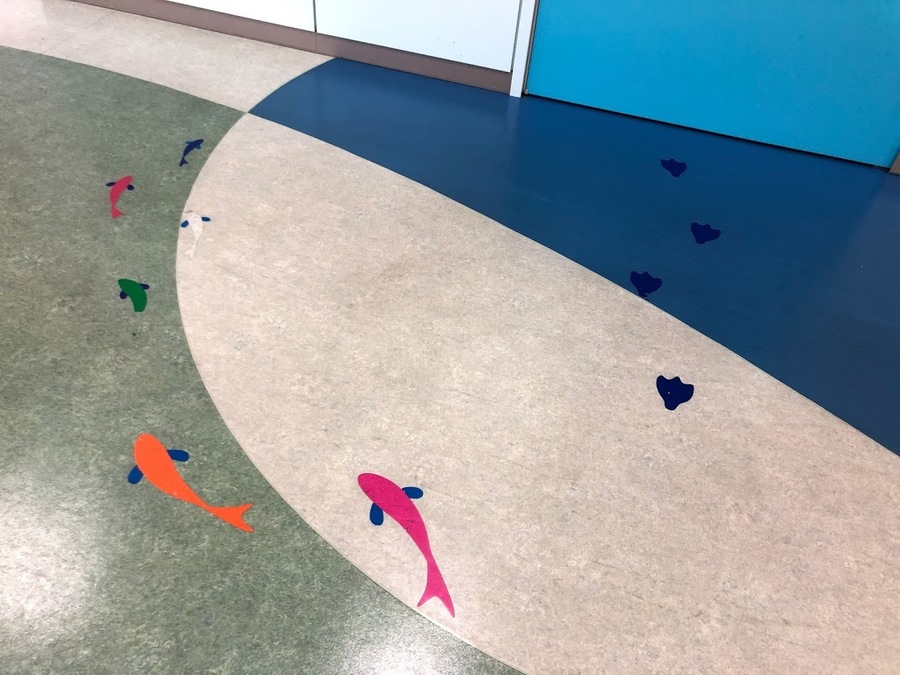 不安を抱いている子供たちを包み込むように、天井にはクジラ、床にはお魚が。