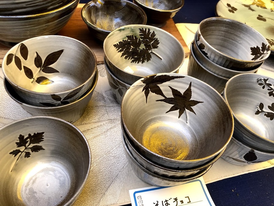 葉を押しつけた柄で「同じ物はない」と言う「日田焼」の新作等も若林さんのオススメ!