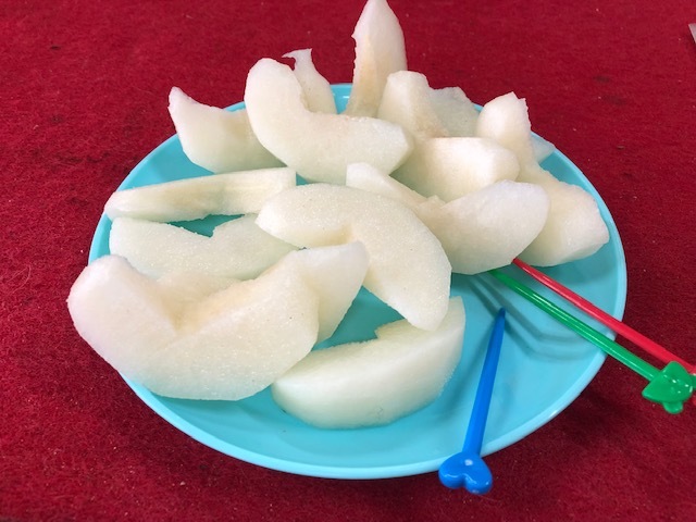 果物ナイフと容器を貸してもらえるので、あとは皮をむいて食べるだけ。
