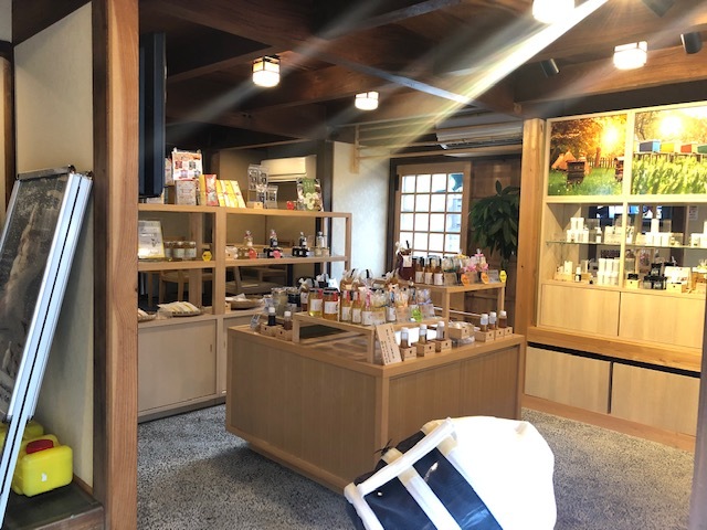 ハチミツの加工品・健康食品・化粧品などの販売やハチミツを使ったカフェスペースがありました。