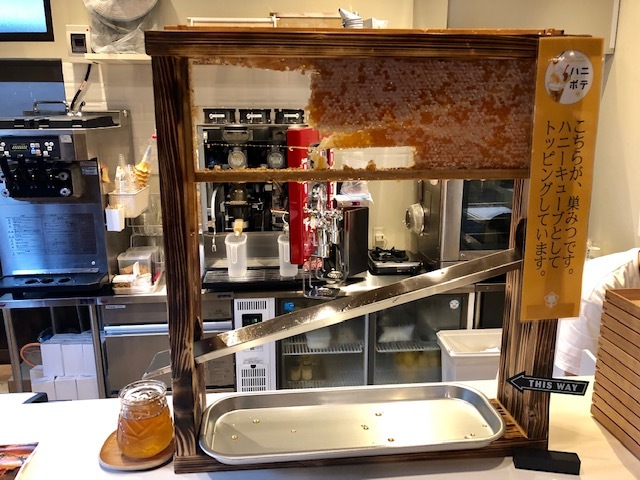 搾り取ったハチミツは、カフェスペースで食べることもできますし、瓶に入れて持ち帰ることもできるんですよ。