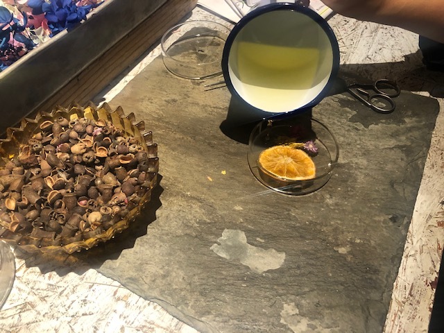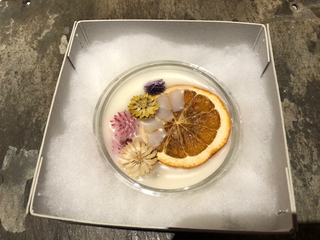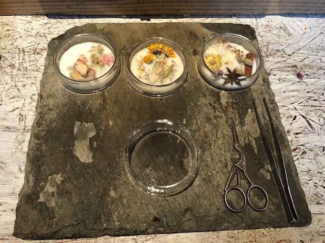 透明のガラス瓶にドライフラワーとオイルを入れたハーバリウム作りなど✨