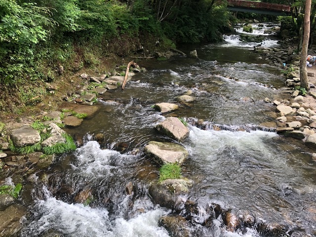 澄んだ青空の下、川のせせらぎが心地よく