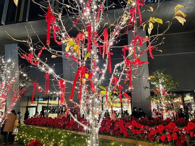 真っ赤なリボンがくくられた木、