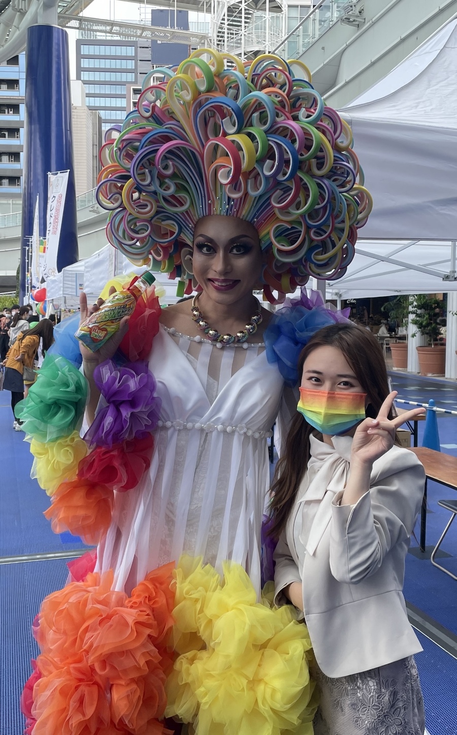 多様性の象徴カラーのレインボーの旗がたくさんあり、