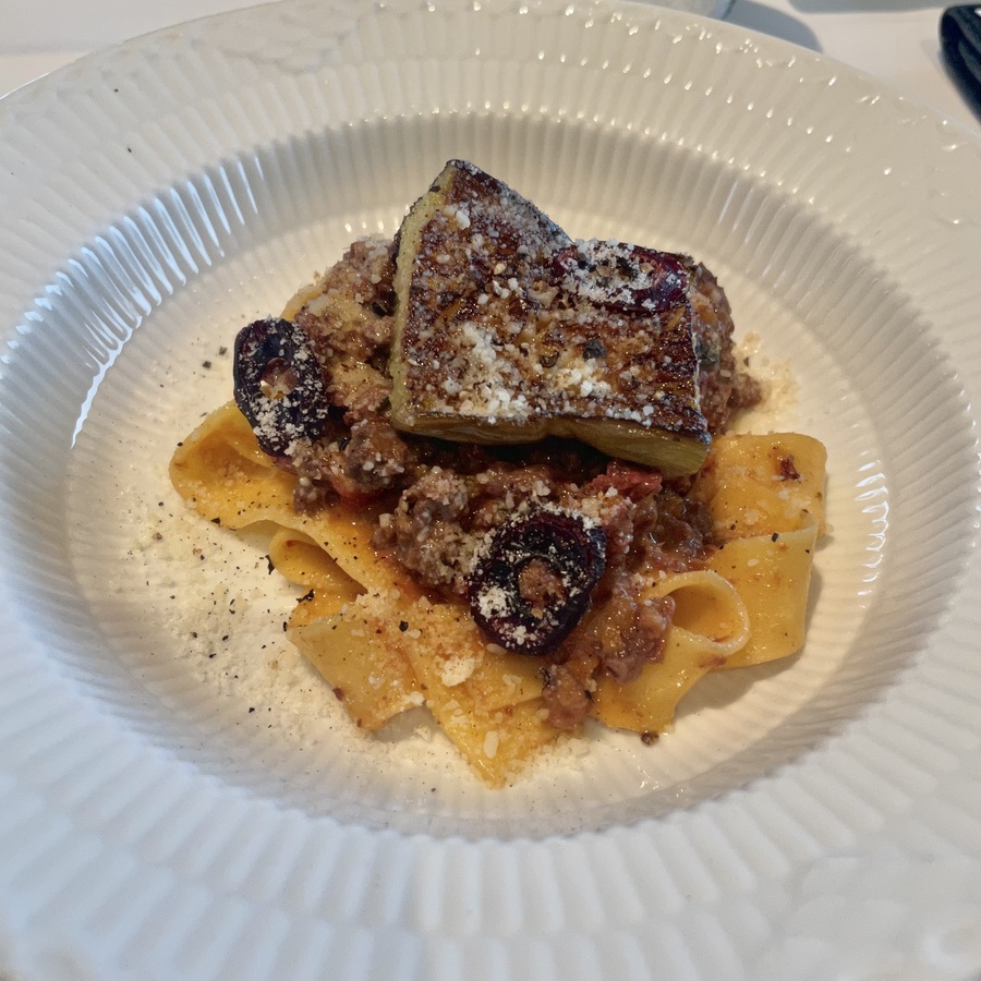蝦夷鹿のラグーとアメリカンチェリー 赤茄子のココット焼きをのせて