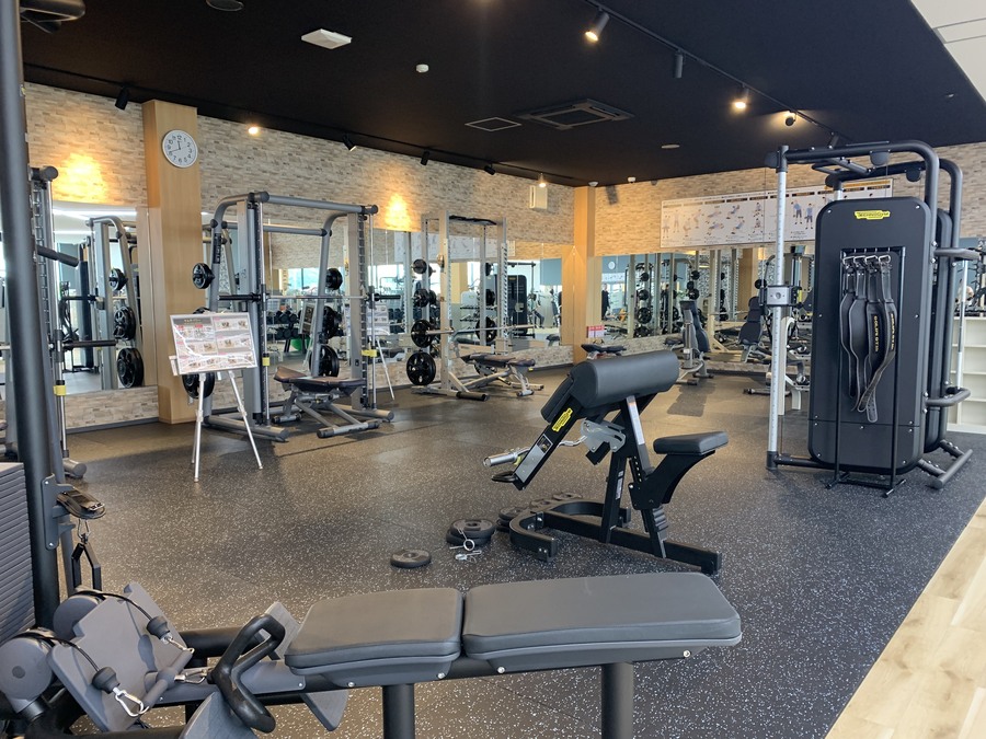 目的別マシンが豊富な広々ジムエリア。