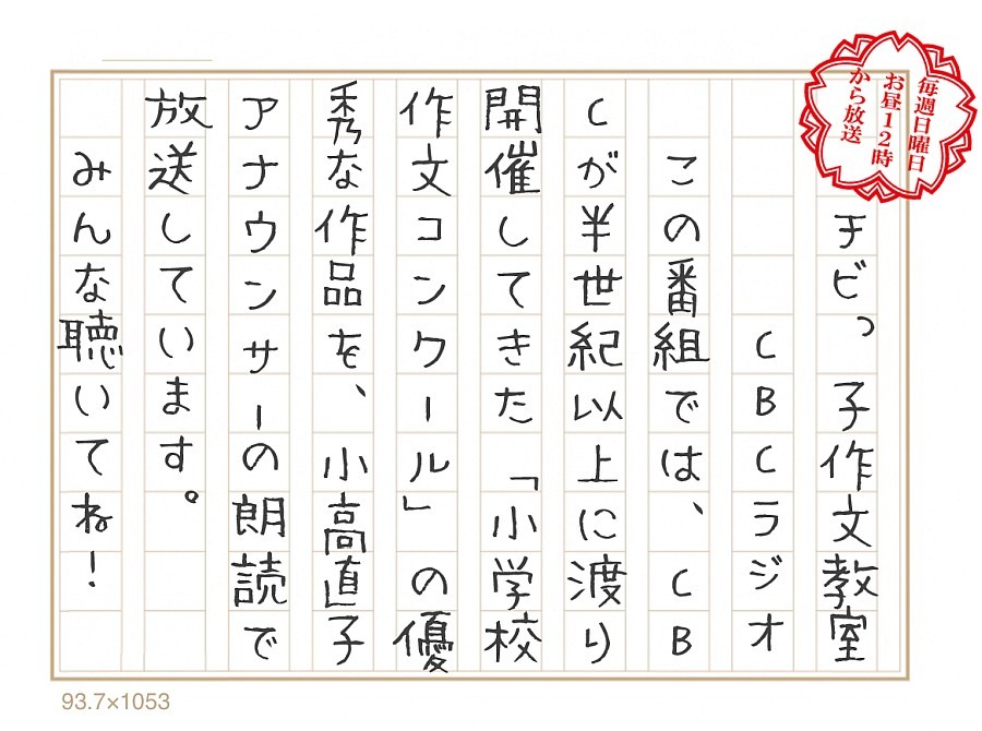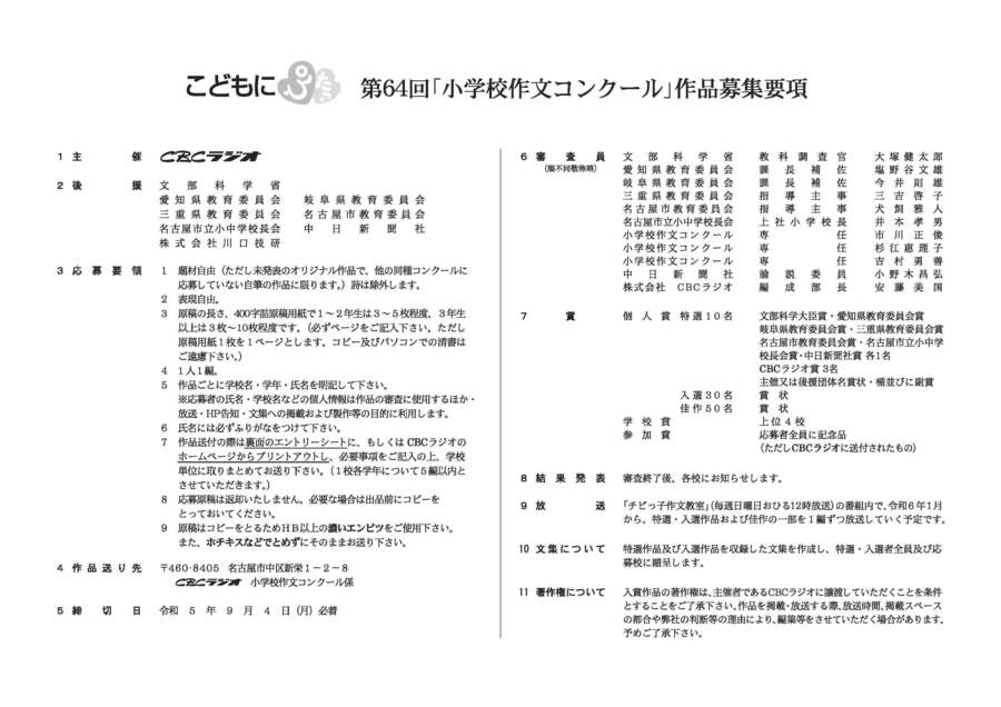 特選・入選作品は文集として編纂され、佳作作品の一部を含む優秀な作品は、CBCラジオで毎週日曜お昼12時00分から放送の番組『チビっ子作文教室』で朗読されます。