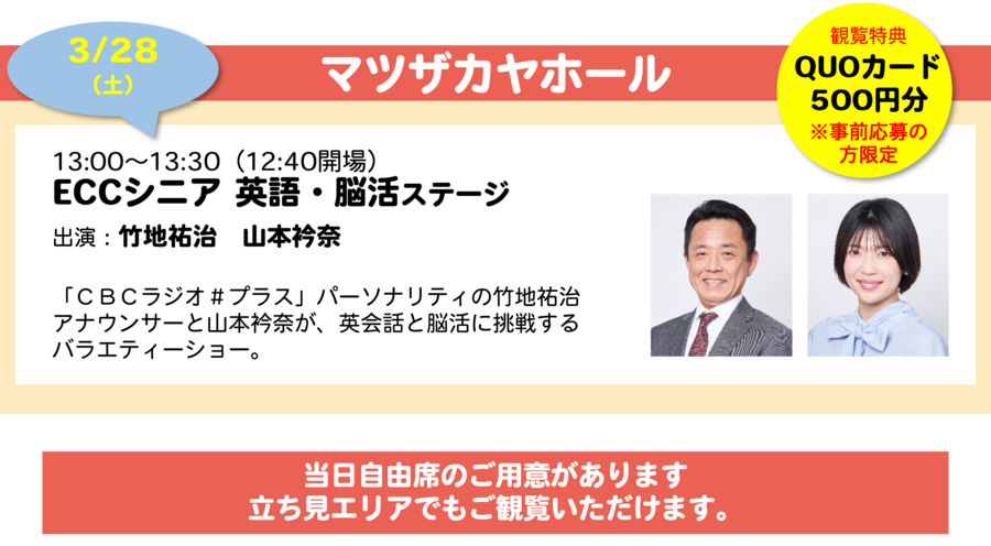 | CBCラジオでは2018年から毎年、終活世代中心に「春の終活文化祭~シニアにYELL~」キャンペーンを開催しています。文化祭という名前の通り、第2の人生を明るく、楽しく過ごしてもらうためのヒントになる企画です。 今回は、1ヵ月間にわたり、4つのワイド番組を中心とした放送展開に加え、イベントも盛りだくさん。3/22(日)にはCBCホールで、3/28(土)&29(日)には、初開催のマツザカヤホールでのイベントも開催します。 |