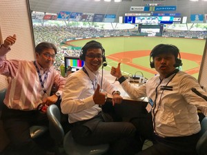 左から、彦野利勝さん、若狭アナ、大谷ノブ彦さん。