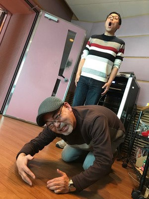 校歌斉唱する若狭監督&砂を集める戸井監督(笑)